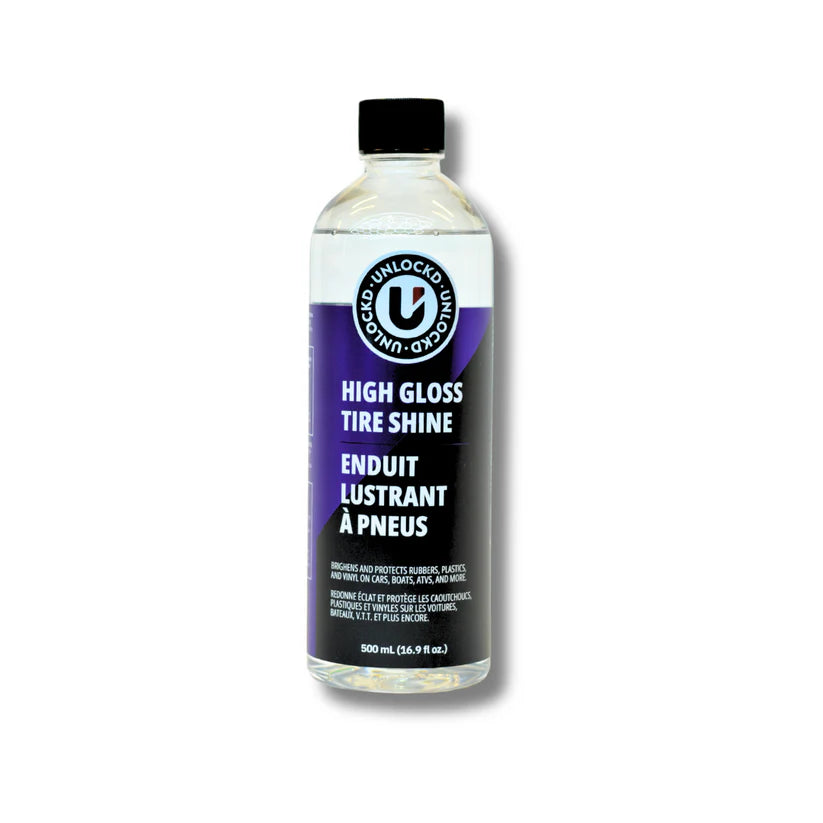 Nettoyez les pneus avec le Nettoyant pour roues et pneus sans acide Unlockd afin d’éliminer les contaminants et résidus de brillants à base de silicone.