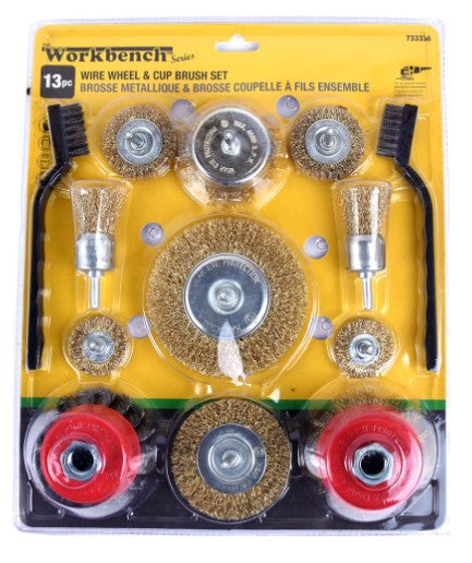 Contient : (2) brosses en acier inoxydable, (6) brosses métalliques - tige de 6 mm, (2) brosses métalliques - tige de 6 mm, (1) brosse métallique à godets - tige de 6 mm, (1) brosse métallique à godets noués de 3'' - arbre de 5/8'', (1) brosse métallique à godets ondulés de 3'' - arbre de 5/8''